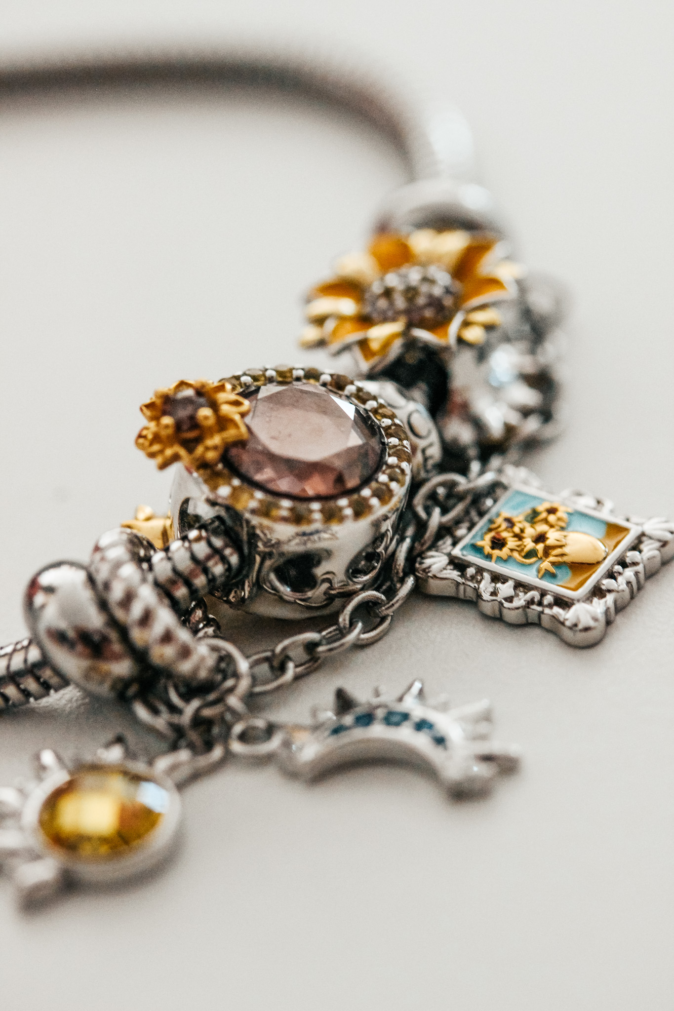 Finalement, après de longues hésitations, j’ai opté pour des pendentifs qui me représentent et que j’adore. Un soleil / lune, des tournesols (l’une de mes fleurs préférées) et un très bel hommage au célèbre tableau du grand Vincent Van Gogh ! Et je suis très contente de mon choix : les charm’s sont très beaux, de très bonne qualité et avec de belles finitions.