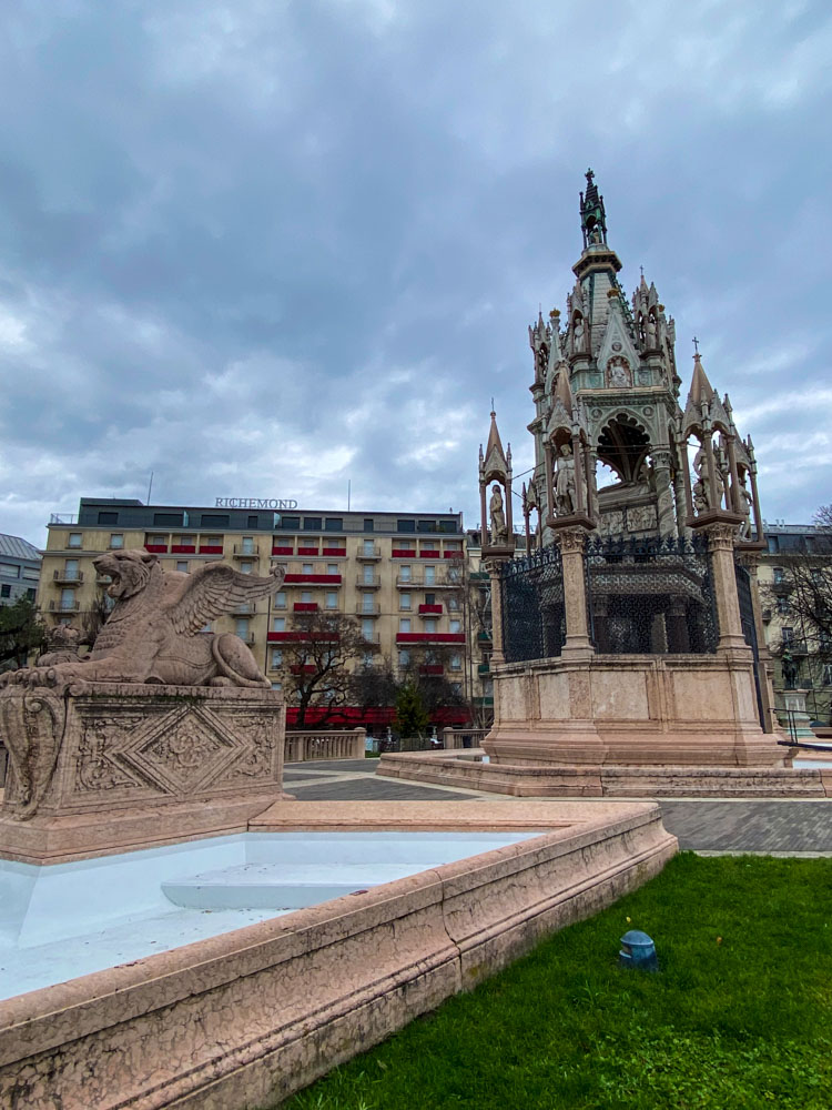 À Genève nous sommes allés à l’essentiel : en longeant le quai du Mont-Blanc nous avons eu une vue imprenable sur le fameux jet d’eau, emblème de la ville. Un peu plus loin sur cette promenade, nous nous sommes arrêtés devant le Monument Brunswick (qui s’avère être un mausolée).