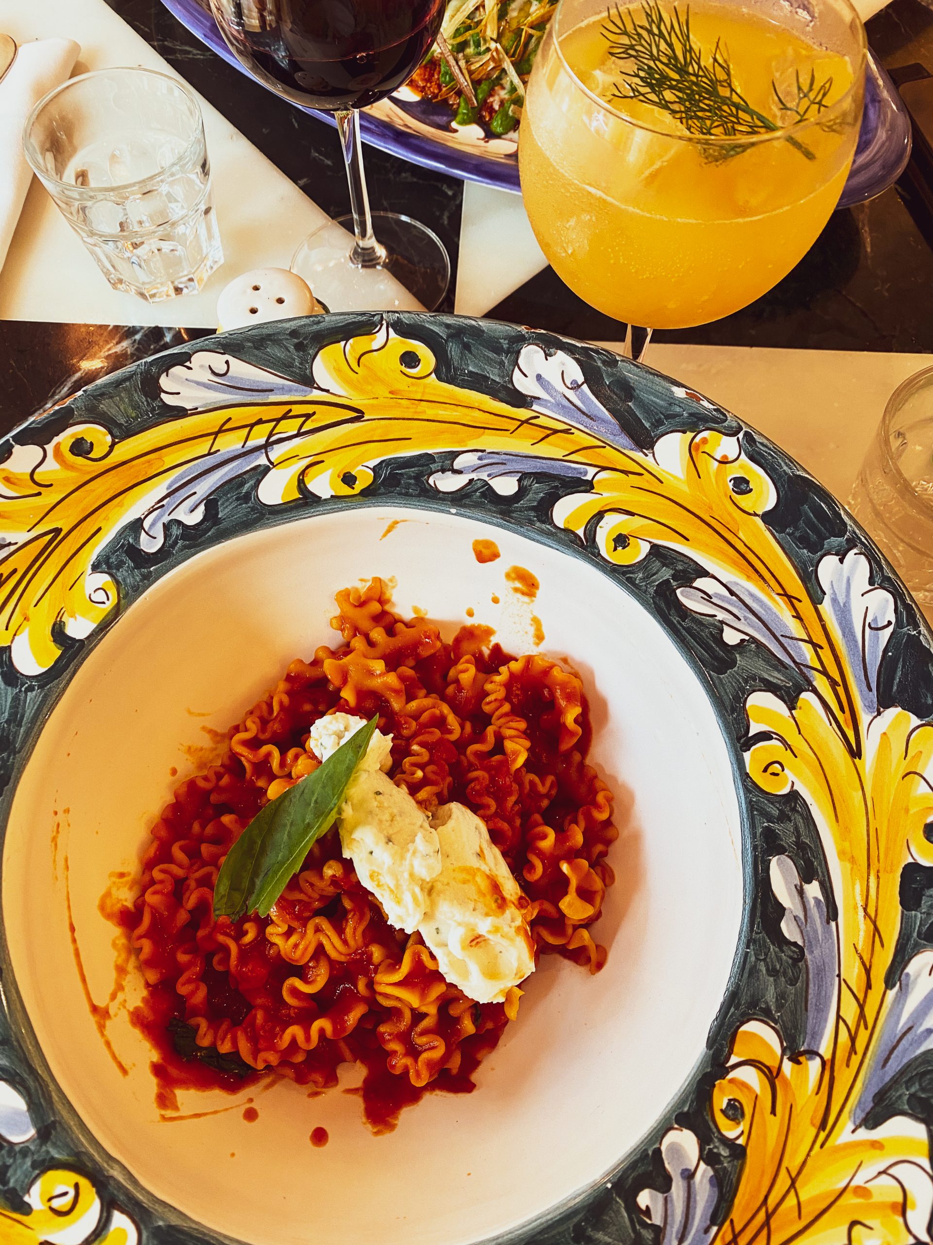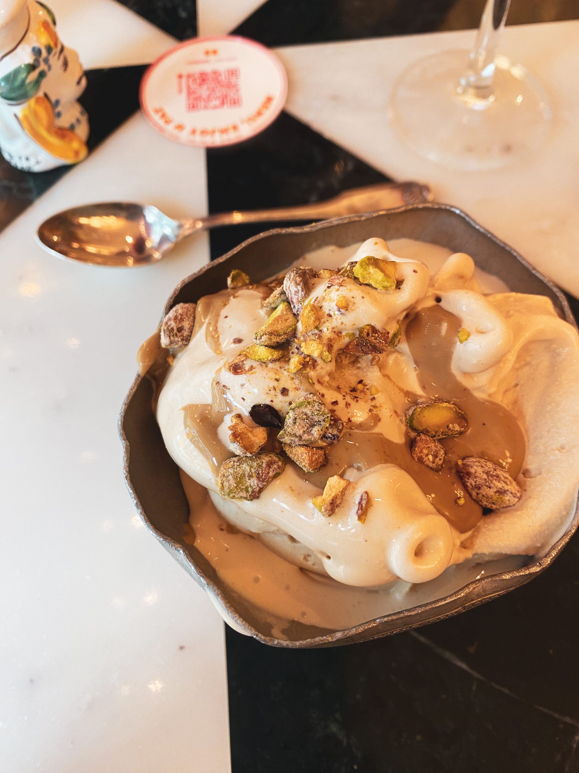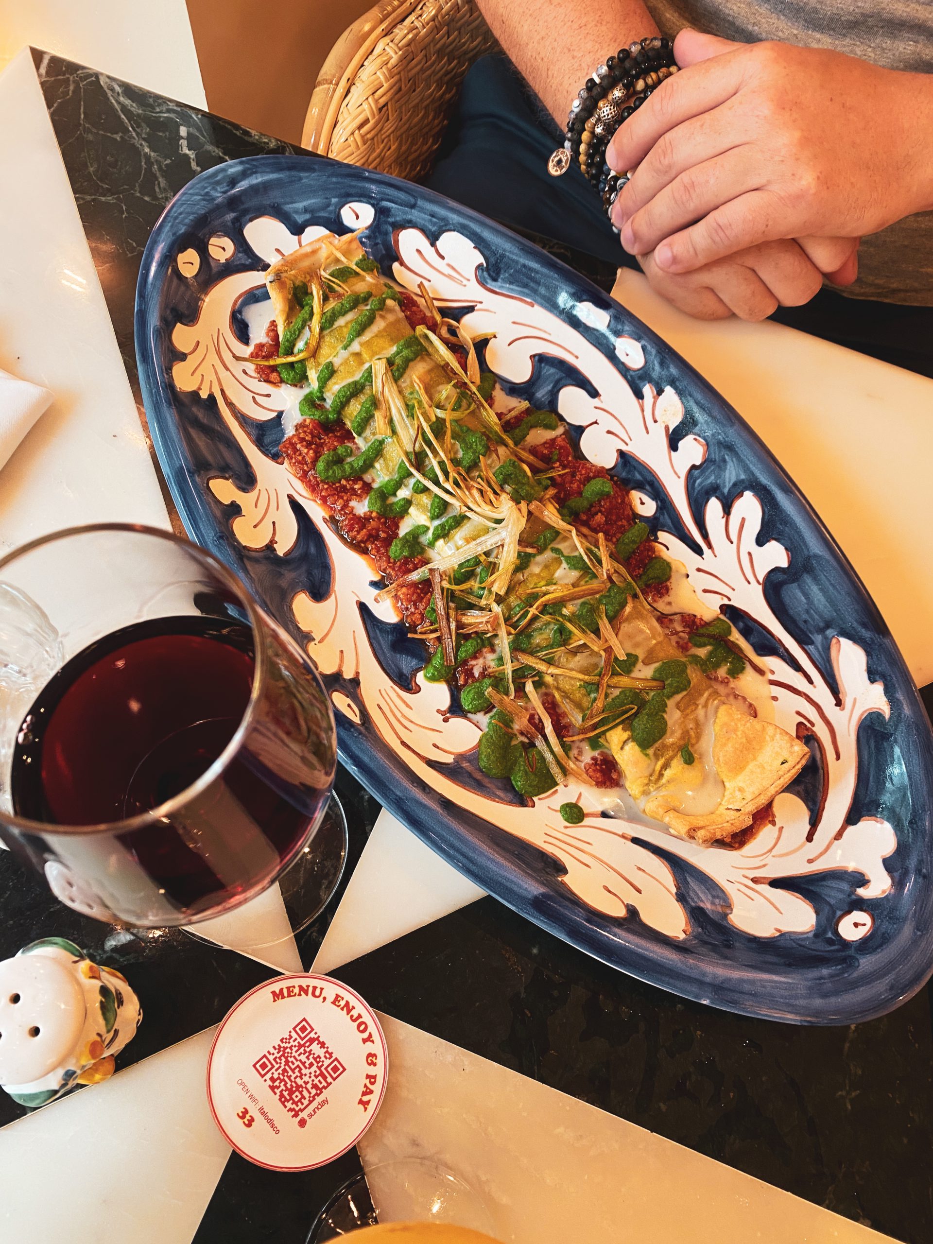 Nous avions pris au menu : un bellini spritz, un verre de vin, un cannelloni kravitz, un « from napoli with love », « il tigramisu » & un « gelato tutto pistacchio ». (Je vous mets le lien direct du menu pour que vous sachiez de quoi je parle).