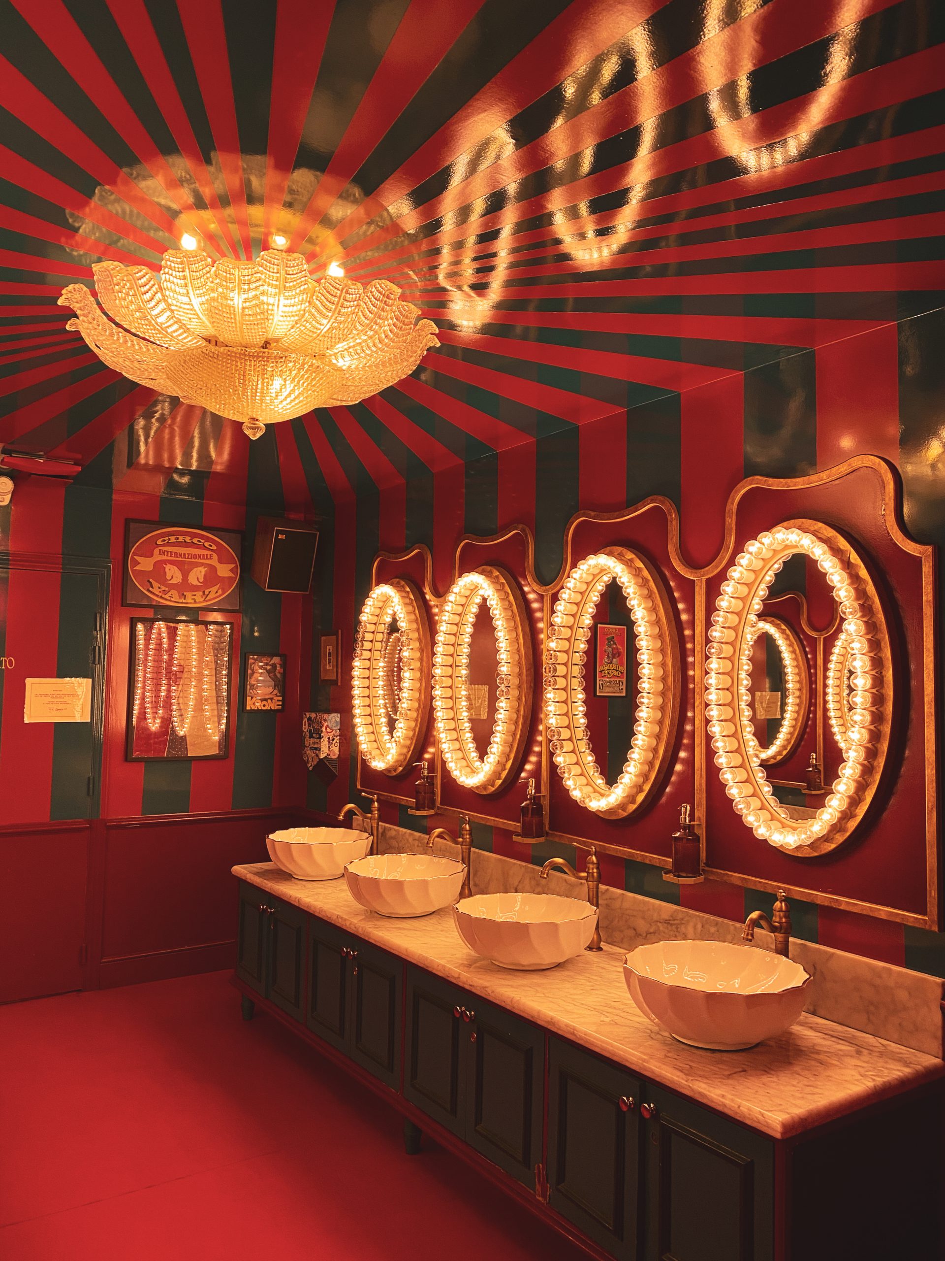 Chaque recoin du restaurant a été pensé pour que nous ayons l’impression d’évoluer comme des artistes : lumières aux fenêtres et aux miroirs comme dans les loges de cabaret, gueule de lion grande ouverte pour accéder aux toilettes, « palais des glaces » …