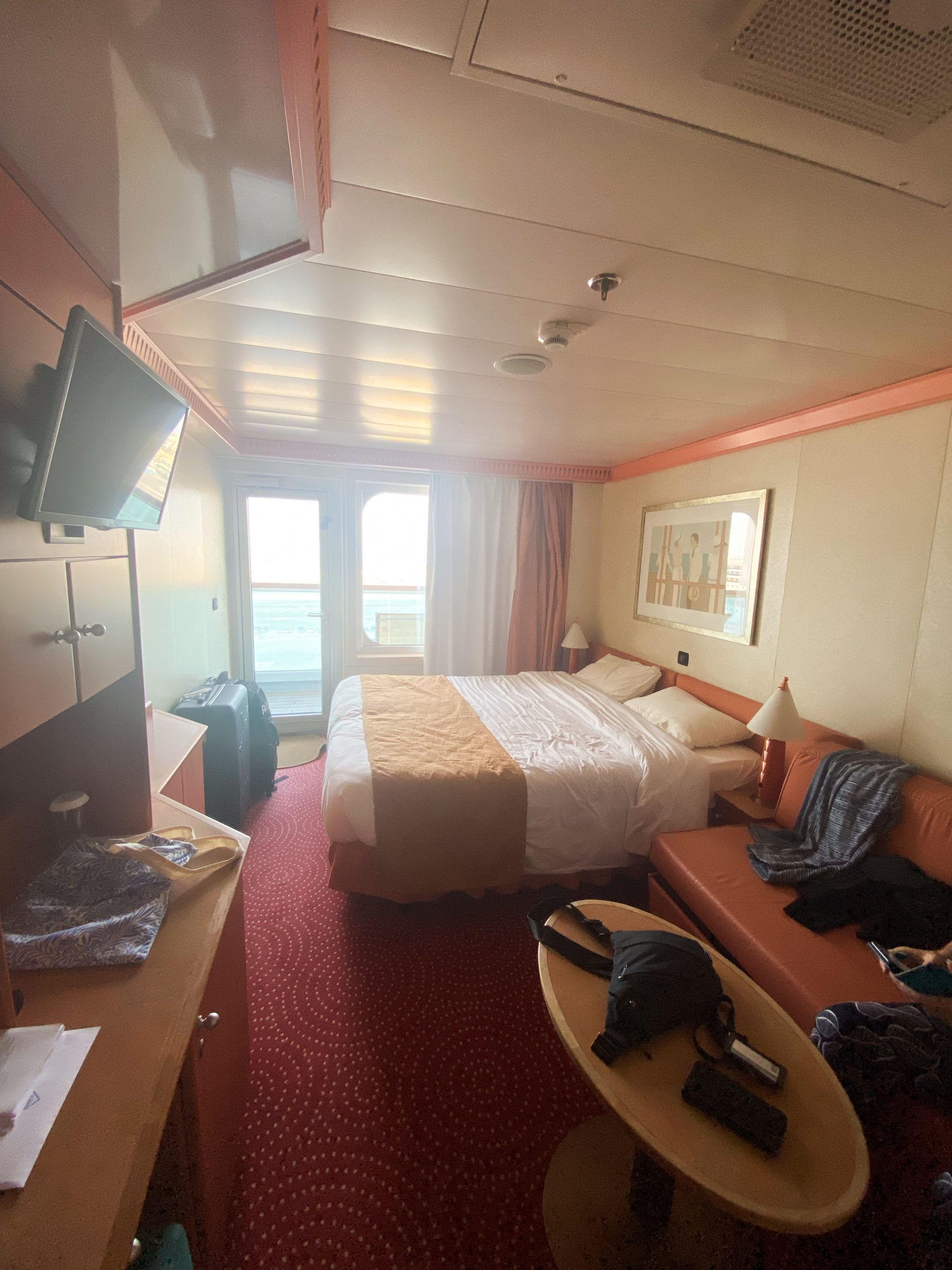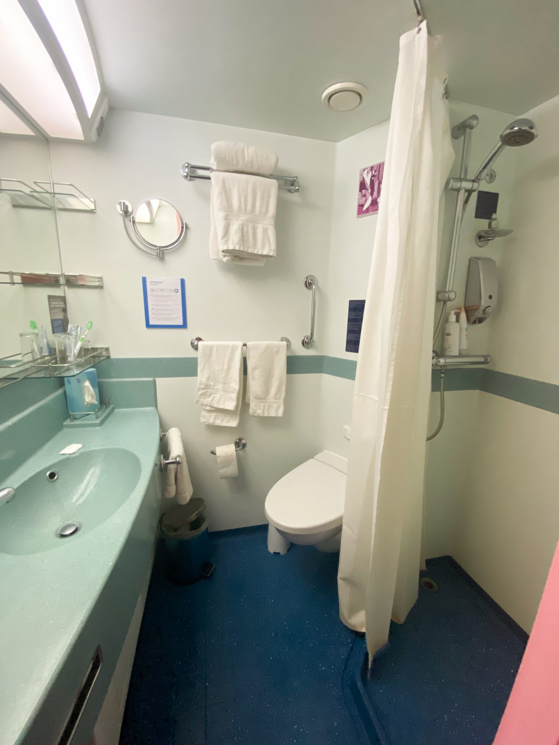 Concernant la chambre, on était plutôt bien lotis : nous avions pris l’option avec balcon, ce qui nous a permis de profiter à fond des différents paysages durant tout le séjour. Elles étaient relativement spacieuses et propres. La salle de bain était très simple, mais faisait largement l’affaire ! (Mais comme vous vous en doutez, un tel confort ça se paye … !)